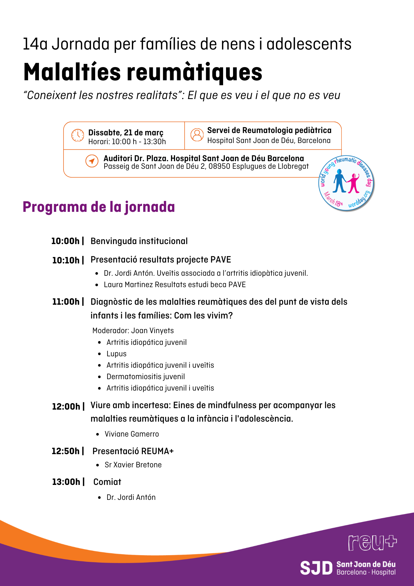 Un any més, el Servei de Reumatologia Pediàtrica de l’Hospital Sant Joan de Déu organitza una jornada adreçada a famílies de nens i adolescents amb malalties reumàtiques. Aquest 2026 celebrem la 14a edició d’aquesta trobada, que s’ha consolidat com un espai de trobada i intercanvi entre famílies i professionals.