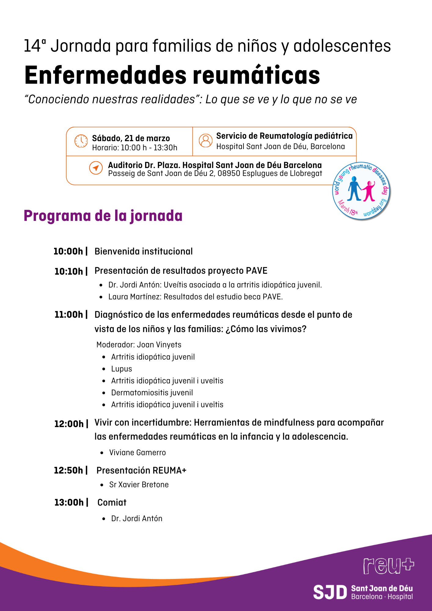 La jornada se enmarca dentro de la celebración internacional del WORD Day, el día de las enfermedades reumáticas en niños y adolescentes, y se alinea con la voluntad de dar visibilidad a estas patologías y a las necesidades de las familias, con la colaboración de la asociación Reu+.
