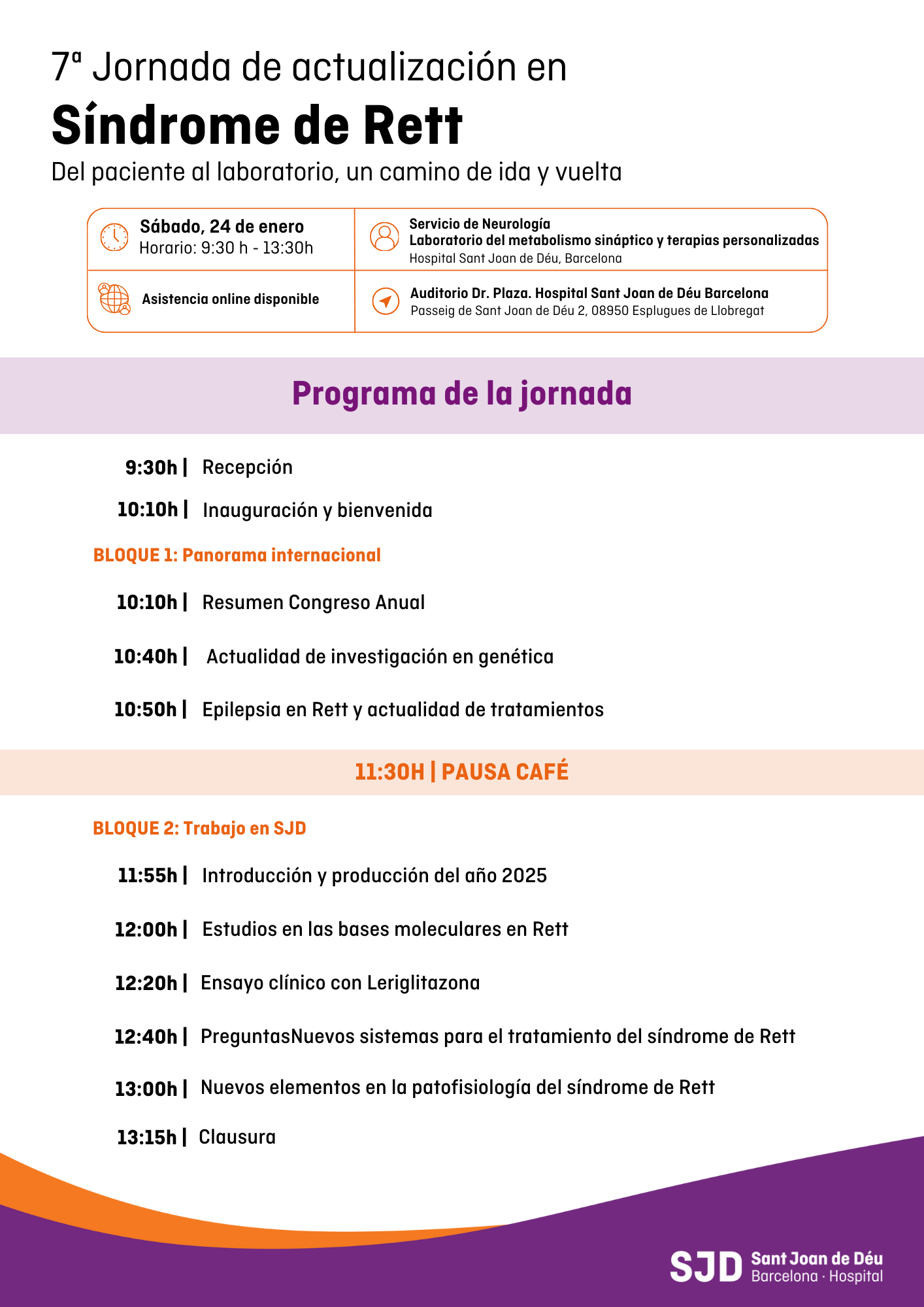 Bajo este lema, el Hospital Sant Joan de Déu celebra un año más la jornada del síndrome de Rett dirigida a pacientes y familias. El objetivo es ofrecer una actualización sobre la experiencia clínica en el Hospital, los avances en genética y terapias, así como las novedades en ensayos clínicos.